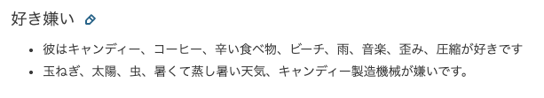 - 嫌い…玉ねぎ、ジャズ、暑い日、虫、パン